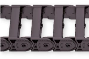 • Eine Nahaufnahme der UA1250-020-030 Energiekette zeigt ihren schwarzen Kunststoffkörper mit einigen geöffneten oberen Abdeckungen, die gelbe Kabel oder Schläuche im Inneren offenbaren.